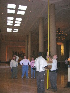 Esteemed APHers Burt Boyer, Janie Blome, and Sandi Baker observe workers changing light bulbs in the 35-foot high ceiling of the Peabody Hotel lobby, as part of their research on "How to change a light bulb in a 35-foot high ceiling without breaking the bulb, and, without dropping the bulb on your head".